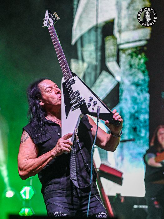 Ventura abandonó entonces su Les Paul para calzarse una llamativa Flying V blanquinegra con la que enfrentaría (casi) todo el tramo final. En un pequeño speech Manuel Martínez recordó cuando la banda recogió sendos premios de la música por el álbum “Aixa” y uno de sus cortes, no otro que el dedicado a su ciudad natal, “Córdoba”. Ni que decir tiene que uno de los momentos más sentidos del set. Una balada / medio tiempo que desde luego les funciona. Revelador el beso de Paco Ventura a la mencionada guitarra al final del corte. Otro momento cargado de significado iba a llegar con el recuerdo al gran Manuel Mart, hijo de Manuel Martínez, voz de Estirpe y que el maldito cáncer nos arrebató hace ahora cuatro años. Su padre, visiblemente emocionado, pidió que ilumináramos con nuestros móviles. Y entre todos, también el propio Mart, cantamos “Sólo y Sin Ti” con un nudo en la garganta. Pelos de punta, emoción desbordada y atronadora ovación final. Puro desgarro. Te recordaremos siempre, titán, no te atrevas a dudar.